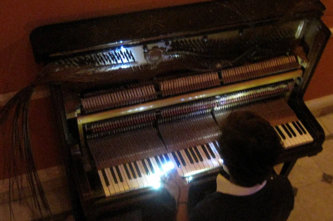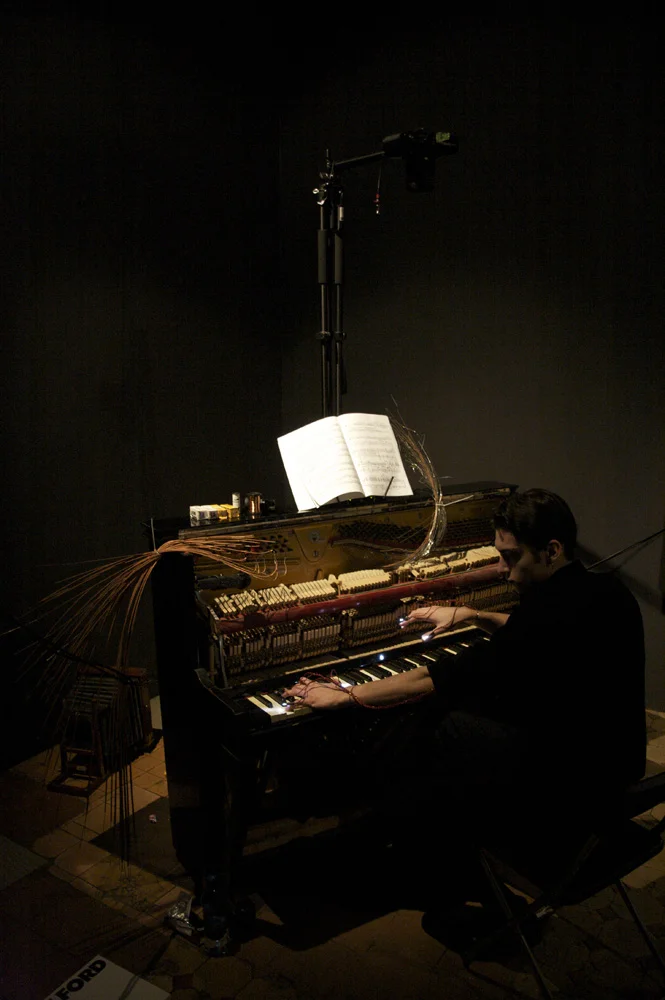 For this performance, a pianist with lights attached to his fingertips played Charles Ives’ 1913 Concord Sonata — a groundbreaking work from the Modernist repertoire that explores musical discord and harmony — on a piano whose strings had been severed. All that could be heard was the dull thud of wood against felt, as the musician fingered his mute instrument and the camera recorded their ineffectual performance.