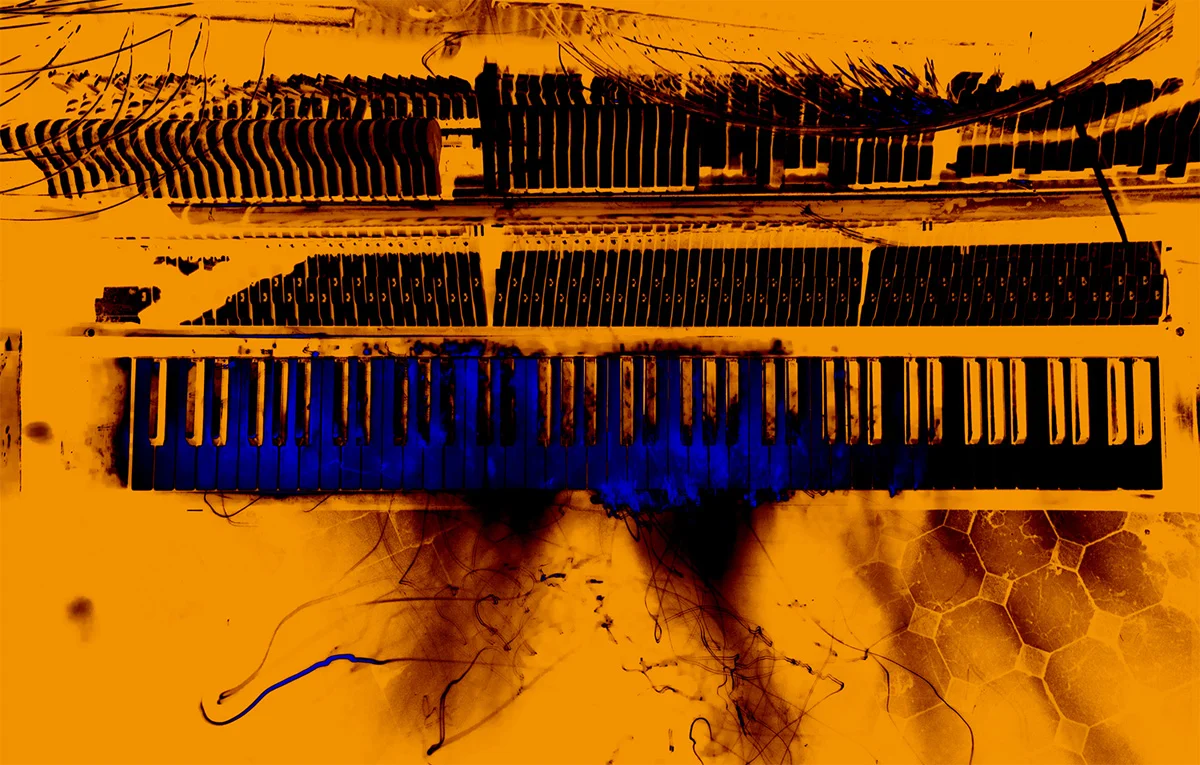 The final image was constructed by setting the camera’s exposure to correspond to the duration of the performance, in this case the time it took the pianist to play Ives’ sonata. The photograph was then separated out into its constituent colors to reveal the information recorded in each channel.